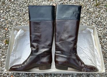 Vendo causa inutilizzo un paio di stivali da donna in vera pelle della marca Voltan 1898, modello Daniels, in un elegante colore marrone marocco/nero di numero di scarpa europeo 38. Usati pochissimo, risultano quasi come nuovi, come mostrano le foto. Si tratta di stivali vintage acquistati negli anni '90.