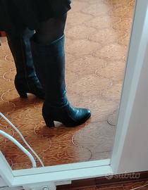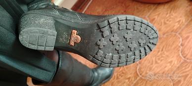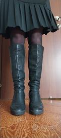 Questi bellissimi stivali neri al ginocchio corrispondono al design dei modelli vintage di Timberland, caratterizzati da una struttura in pelle con cuciture a vista e tacco grosso. Dettagli del Modello: Materiale: Pelle nera di alta qualità con finitura leggermente martellata. Design: Modello alto fino al ginocchio con chiusura a zip laterale interna e punta arrotondata. Suola: Suola in gomma spessa, spesso definita a "carroarmato" o con texture ruvida, abbinata a un tacco a blocco robusto. Usati poco come si può vedere dalle foto e dalla suola che è integra.