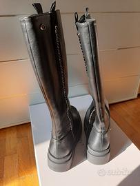 Stivali donna neri n° 37, come nuovi, usati pochissimo (foto suola). Altezza 40cm. Confezione originale, con sacchetto per singolo stivale + sacchetto da viaggio, con strass di scorta(foto confezione). MARCA MOTIVI