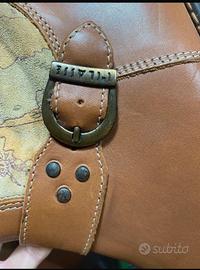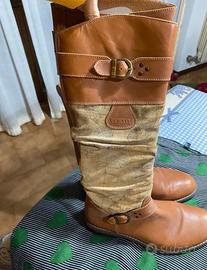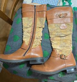 Vendo stivali da donna in pelle color cuoio con inserti in tessuto stampato a mappa, molto particolari e comodi.