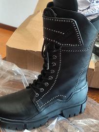 Stivali alti Guess da donna, modello biker. Sono in pelle nera e presentano dettagli con borchie. Ideali per un look grintoso e alla moda.