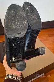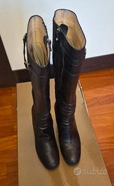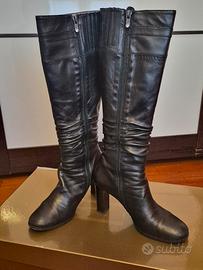 Stivali in vera pelle nera Luca Verri modello Amalfi, altezza al ginocchio, tacco 7 cm (9 cm sul tallone), chiusura con cerniera verso l'interno impreziosita da brillantino, cuoio molto morbido, numero 38, vestibilità aderente al polpaccio, usati molto poco, suole e tacchi in ottime condizioni, tenuti davvero benissimo. Scatola e buste interne originali.