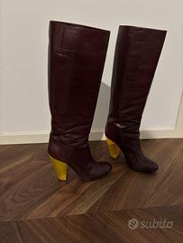 Stivali donna marca Marc by Marc Jacobs di pelle bordeaux e tacco plexiglass giallo.stagione invernale.taglia 39 ,punta a mandorla ,usati in buone condizioni :nessun difetto visibile, altezza tacco media circa 8/9cm
