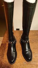 Stivali in pelle nera di alta qualità, realizzati con materiali selezionati e finiture curate. Questi stivali sono ideali per ogni occasione, dal look casual al look elegante, e possono essere abbinati a gonne midi, pantaloni aderenti o outfit dal taglio sartoriale; offrono un mix perfetto di eleganza e versatilità.