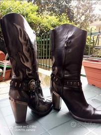 stivali new rock donna in vera pelle e tacco in ferro numero 40/41, come foto tenuti molto bene, colore nero e argento. Ritiro a mano a Montecatini terme (pt)