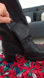 Stivali donna Pentium tacco comodo carrarmato biker, modello casual, tomaia in ecopelle effetto delavè, nuovi, provati solo in negozio e conservati in scarpiera perché piacendomi c'era solo questo numero e comunque li ho acquistati ma in realtà venendomi larghi visto che io ho un 38 mai indossati, tacco robusto ed il gambale di ampiezza regolabile, cerniera su lato interno. Altezza tacco cm. 9 Altezza gambale compreso tacco cm. 36
