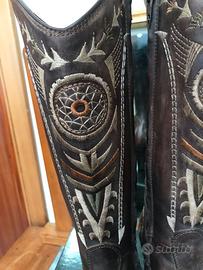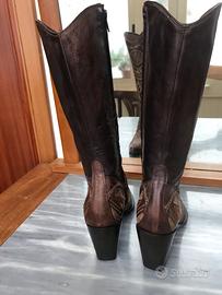 Texani donna artigianali di alta qualità. Nuovi con scatola originale. Molto particolari con ricamo stile country. Tutto in vera pelle e suola in cuoio. Marca Kobra made in Italy. Altezza tacco cm 8. Colore principali testa di moro. Numero 35.