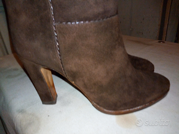 Stivali donna in camoscio nr. 34 , testa di moro , altezza 43 cm. tomaia in cuoio , pari al nuovo , usati pochissimo ,stati sempre con la forma dentro (15 euro) ;