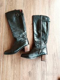 Stivali usati pochissime volte. Colore nero in simil pelle. La punta della scarpa sinistra è un po' aperta.
