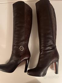 Stivali trussardi donna n39 in pelle e lucertola , colore marrone scuro . Acquistati in uno showroom , usati 1 volta . Non hanno la cerniera ma si calzano benissimo .
