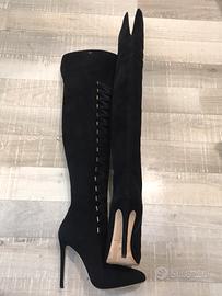 Stivali Elisabetta Franchi in camoscio neri con intrecci, lunghi 67cm (tacco 10cm) in perfette condizioni