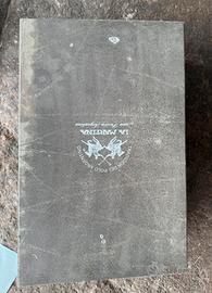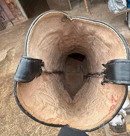 Stupendi boots cowboy artigianali La Martina (brand premium argentino del polo, tradizione e passione argentina autentica). Pelle esotica python/snakeskin autentica (non print!) beige-oro con ricami neri elaborati (motivi aquile/ fiamme, super eleganti e unici). • Gambale nero in pelle morbida, suola in gomma Valentina antiscivolo (robusta, con borchie per grip extra). • Taglia 28 (Argentina) & EU 42 uomo / large donna (lunghezza pianta interna circa 28 cm - misura prima se hai dubbi!). • Modello stile polo/cowboy, basso tacco, perfetti per look western, country, equitazione o outfit statement. Condizioni: Usati ma in buono stato generale - pelle viva e squame irregolari tipiche del python vero, niente crepe evidenti, solo segni normali d'uso (un po' di polvere/fieno dall'ambiente stalla, interno consumato ma pulibile). Pull tabs con piccoli segni, suola sporca ma grip ancora ottimo. Li ho tenuti con carta dentro per mantenere la forma.