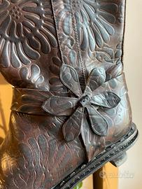 Stivali originali Fendi, realizzati in vera pelle (vero cuoio), colore marrone scuro con elegante lavorazione goffrata floreale su tutta la superficie.