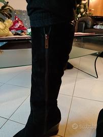 Stivali neri scamosciati con tacco con plato' 10. rifiniture in vernice. Perfetti usati pochissimo. Punta stonata, comodi.