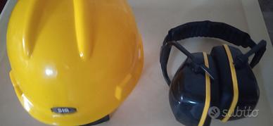 Stivali in gomma N.42 con punta antinfortunistica, elmetto e cuffie.