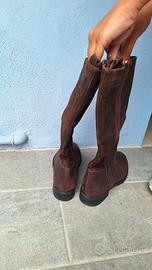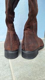 Stivali in vera pelle lavorata spazzolata, color marrone castagna calda / testa di moro con cuciture visibili leggermente più chiare. Modello molto classico con leggerissima punta, gambale alto 33 cm fino a metà polpaccio circa e tacco basso (3 cm).