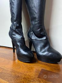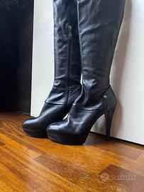 Stivali in pelle nera Guess sopra il ginocchio con tacco alto e plateau. Numero 40 tacco 12