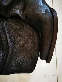 Stivali donna, stile cowboy, con gamba morbida lunga cm 19 e larghezza da cm. 29 alla caviglia fino a un massimo di cm 37 al bordo in alto, in vera pelle color testa di moro e fondo in vero cuoio, tacco cm. 6. Marca San Crispino. Taglia n. 41. Nuovi, mai indossati per errore acquisto. Vengono forniti nella loro scatola originale.