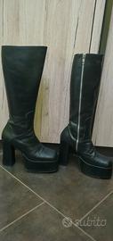 Stivali in vera pelle di vitello, tinta nera, con suola in cuoio.Altezza tacco 12cm, altezza plateau 5cm Rivestimento interno in pelle. Perfetti, senza graffi. Numero 38 ma adatti anche ad un 37 con solettina. Acquistati da MM Milano. Usati ma tenuti maniacalmente. Senza scatola