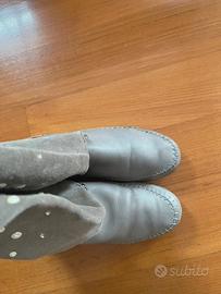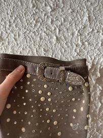 Splendidi stivali Indianini (stile mocassino alto) in una ricca tonalità beige/tortora. Questi stivali, interamente Made in Italy, presentano una tomaia in morbida pelle scamosciata decorata con perle e strass luminosi. Il gambale è rifinito con una fibbia in metallo regolabile e decorata in stile western/vintage.