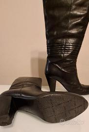 Stivale in morbida pelle con plissettatura sul collo del piede e punta stontadata. Tacco a cono ricoperto, femminile e confortevole. Usati poche volte..