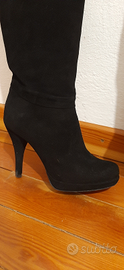 Stivale in camoscio nero numero 36, gambale morbido alto sopra il ginocchio. Comodissimo. Gommini per i tacchi di ricambio inclusi. Tacco 10 cm e piccolo plateau di 1 cm circa. Usati pochissimo.