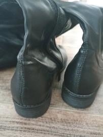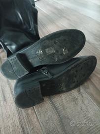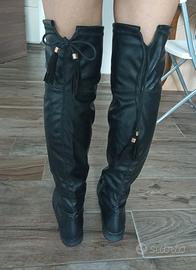 Stivali finta pelle, alti sopra il ginocchio, laccio con nappe dietro da poter sistemare come si vuole, cerniera ai lati interni, suola in buone condizioni perché usati poco, sciupatura dietro sinistra ultima foto