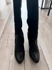 Stivali lunghi neri realizzati in pelle e camoscio, con tacco largo per un comfort impeccabile. Internamente felpati e caldi