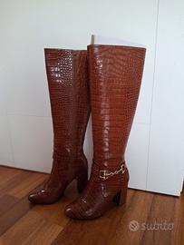 Stivali marrone stampa coccodrillo, numero 36, altezza tacco 9cm, altezza gambale 40cm (dall'inizio del tacco), chiusura a cerniera zip