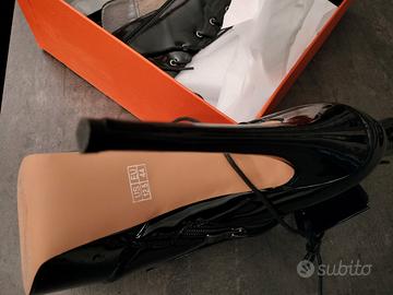 vendo stivaletti pelle vernice lucida neri,come da foto mai usati,ancora con scatola originale, numero 44 tacco 14,stringhe più cerniera zeppa,ordinato con numero sbagliato