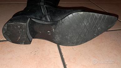 Stivali neri Seriezero numero 40, in similpelle con punta affusolata e tacco medio. Zip laterale e piccolo cinturino decorativo alla caviglia. Stivali al ginocchio, linea molto slanciata, perfetti con jeans o gonne.