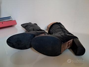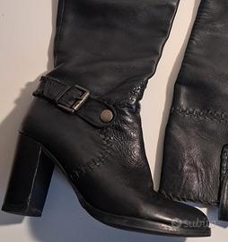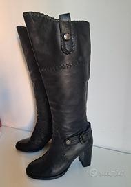 Stivali alti neri in morbida pelle, tacco 8,5. Interno color cuoio, gamba più alta davanti (40-36 cm dal tallone) e larga (17 cm al polpaccio), suola in cuoio. Indossati una sola volta, calzata confortevole.