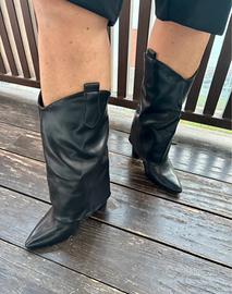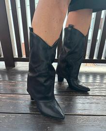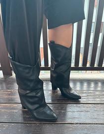 Stivali neri in ecopelle, modello morbido effetto “slouchy”, con punta leggermente affusolata e piccolo tacco comodo.