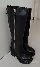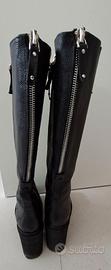 Stivali neri vera pelle con cerniere, altezza sotto il ginocchio, fondo in gomma con tacco largo e plateau. Usati 2 volte. Numero 36.