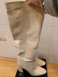 Stivali in pelle morbida lunghi, color burro, n.40, tacco 7 cm, made in Italy.