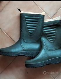 Vendo stivali impermeabili con imbottitura calda interna fissa. Lo scafo e la suola sono in condizioni eccellenti (vedi foto del battistrada quasi intatto), puliti e igienizzati internamente. (Vedi foto). La bordatura superiore in similpelle presenta uno spellamento (difetto puramente estetico dovuto al tempo rimasti in garage senza mai essere usati perché dimenticati) Gli stivali restano perfettamente funzionali e caldi. Ideali per orto, giardino o lavori all'aperto.Ideali per pescatori e cacciatori che cercano uno stivale robusto, caldo e con ottimo grip. Suola praticamente nuova, perfetta per terreni scivolosi o fangosi. Interno igienizzato. "Per la Caccia Isolamento termico: La calza interna (anche se fissa) offre quel calore necessario per le lunghe attese al freddo o nei boschi in inverno. Per la Pesca Impermeabilità garantita: Essendo lo scafo gomma/EVA integro i piedi resteranno asciutti anche stando nel fango o vicino all'acqua. Spedizione disponibile e garantita in 24h. Imballaggio e confezionamento ben curato. #stivalidagomma #stivalitermici
