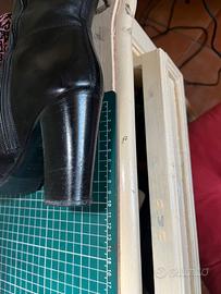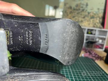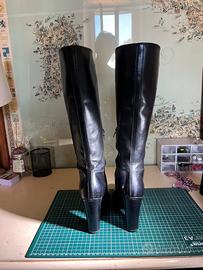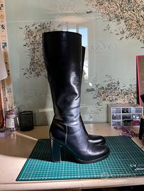 Stivali Prada originali in pelle nera, Made in Italy. Modello al ginocchio con tacco largo stabile (circa 8,5 cm), eleganti ma anche comodi per uso quotidiano. Condizioni molto buone: pelle ben tenuta, normali segni d’uso sulla suola (vedi foto). Calzata regolare. Numero 36. Prezzo leggermente trattabile