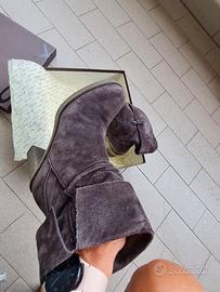 Stivaletti marca Sax tacco 9 cm taglia 39 scamosciati colore grigio fumo, plateau 1 cm, risvoltabili e morbidissimi al polpaccio, cuciture a vista, cerniera super rifinita, usati pochissimo come nuovi.