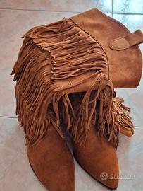 Vendo bellissimi stivali in stile Boho-Chic / Western color cuoio/tabacco. Il modello è caratterizzato da tre livelli di frange che donano movimento e un tocco originale a qualsiasi outfit. Usati ma in buone condizioni. Numero 40.