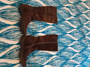 stivali scamosciati marroni, piccole macchioline alla base di uno dei due