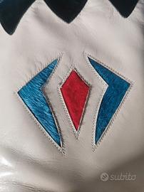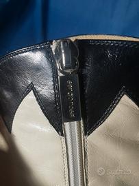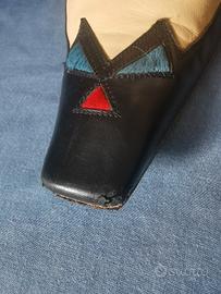 Un modello difficile da trovare: pelle morbidissima color panna e nera, inserti in cavallino azzurri e rossi, tacco in legno e suola Vibram praticamente nuova (comodità infinita).