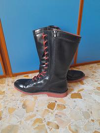 Stivali Kickers originali in vernice di pelle, suola e lacci arancioni, nr. 40 (piccolo, calza come 39), usati poco, in ottimo stato, lievi strusciature sulla parte interna della scarpa sinistra (foto).