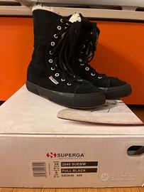 Stivali donna Superga originali numero 36. Stivali in camoscio nero morbide con pelo bianco, con stringhe e cerniera laterale.