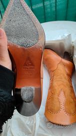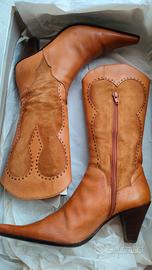 Splendidi stivali in stile texano realizzati artigianalmente in Italia con materiali di pregio. Questo modello unico combina una struttura in vero cuoio color cuoio naturale con raffinati inserti in scamosciata tono su tono, impreziositi da micro-borchie che disegnano motivi sinuosi lungo il gambale. La taglia è un 38 e mezzo, una misura spesso difficile da trovare, con un tacco a cono solido e comodissimo e una chiusura a zip laterale per una calzata pratica.