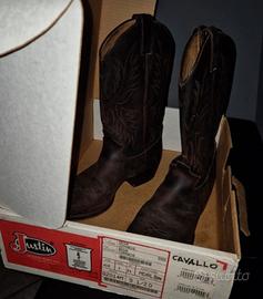 Vendo stivali texani in pelle autentica, colore marrone scuro, con cuciture decorative tipiche sul gambale.