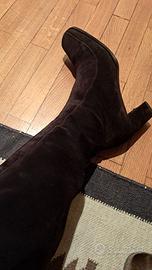 Stivali in pelle scamosciata marrone. Sono stivali fine anni '90, vero accessorio vintage, provengono da una sfilata Chiara Boni e uso in showroom. Il taglio è appunto vitage, con cuciture a vista, silhouette "stretta", tacco importante ma non troppo alto e punta squadrata. Sono meravigliosi, perfetto per chi ama lo stile chic di una volta. Ritiro Torino e dintorni e Alba e dintorni.