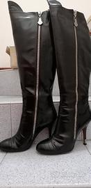 Stivali Trussardi N° 40.5 tacco 11 cm, gambale con stampa coccodrillo nero. Lunghezza del gambale sotto il ginocchio con finitura in pelle che allunga il gambale anteriore. Hanno la zip in metallo lato interno ed esterno al gambale lunga tutto il gambale, cursore con inciso il simbolo del brand. Mettono molto in risalto la gamba, sono fashion glamour di classe. Sono usati pochissimo. Vedi le immagini.