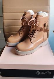Bellissimi stivaletti modello anfibi dell'azienda Twin Set, n.37, di colore beige con suola esterna antiscivolo, chiusura con cerniera laterale, laccetti e fibbia dorata con logo: tutto regolabile! Nuovissimi mai utilizzati con scatola dust ed etichetta ancora attaccata sotto la suola, come da foto! Costo originario 260 euro: vendo a 70 euro: prezzo affare!!!