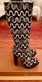 Stivali in tessuto a fantasia nero e beige con tacco in vernice nero