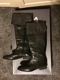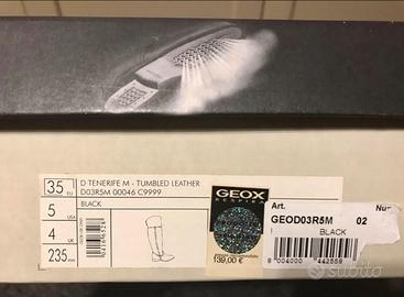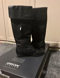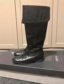 Splendidi stivali Geox in vera pelle nera, numero 35, perfetti per la stagione fredda e piovosa grazie alla rinomata suola traspirante "Geox Respira". Sono stati usati poche volte e si presentano in ottimo stato, come visibile dalle foto. La pelle ha mantenuto una buona consistenza con minime pieghe naturali dovute all'uso, e la suola è in condizioni eccellenti. Il materiale è 100% pelle liscia di alta qualità (tomaia e soletta), con suola in gomma. Hanno un modello classico ed elegante, stile cavallerizza, versatile e intramontabile, con altezza al ginocchio e un risvolto morbido e pieghevole sul gambale. Il tacco è basso e largo per garantire comfort e stabilità per tutto il giorno, e la chiusura è con cerniera laterale per una calzata facile. La scatola originale è disponibile e inclusa nel prezzo. Ideali per chi cerca un capo di qualità, comodo e raffinato, perfetto sia per look eleganti che quotidiani.
